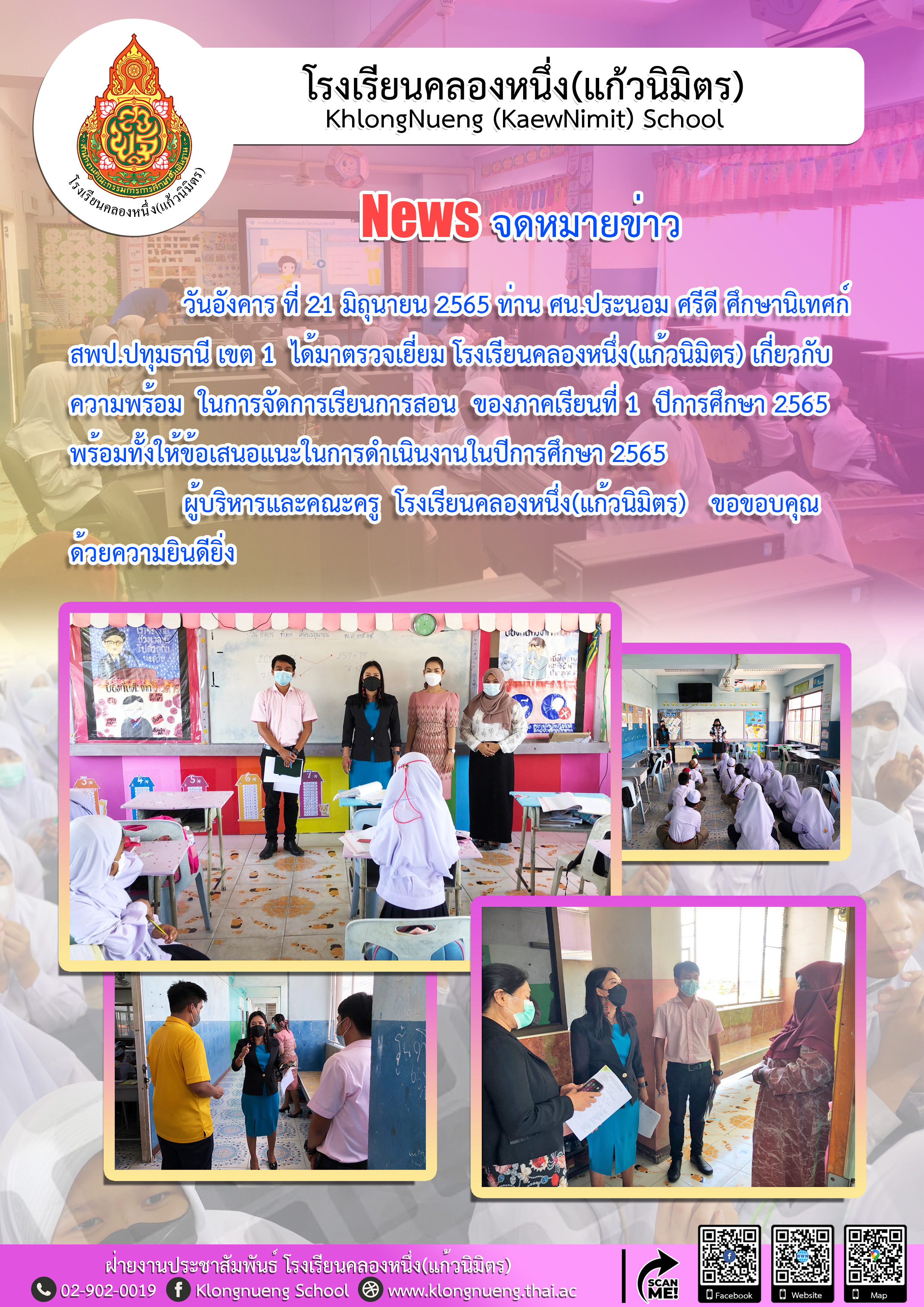 21 มิถุนายน 2565 ท่าน ศน.ประนอม ศรีดี ศึกษานิเทศก์ สพป.ปทุมธานี เขต 1 ได้มาตรวจเยี่ยมโรงเรียนคลองหนึ่ง(แก้วนิมิตร)